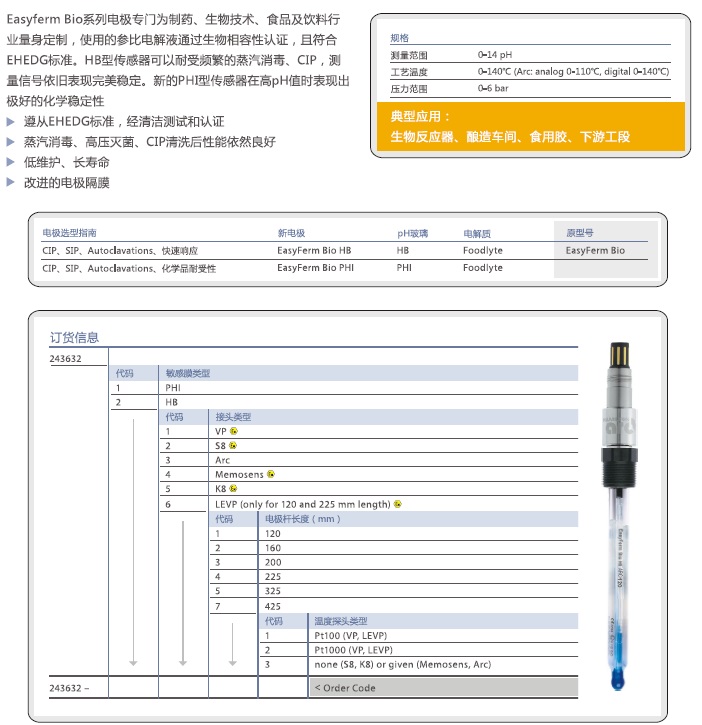 Easyferm Bio系列電極專門為制藥、生物技術(shù)、食品及飲料行業(yè)量身定制,,使用的參比電解液通過生物相容性認(rèn)證,,且符合EHEDG標(biāo)準(zhǔn)。HB型傳感器可以耐受頻繁的蒸汽消毒、CIP,,測(cè)量信號(hào)依舊表現(xiàn)完美穩(wěn)定。新的PHI型傳感器在高Ph值時(shí)表現(xiàn)出極好的化學(xué)穩(wěn)定性。