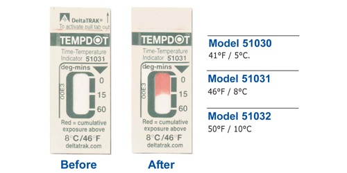 DeltaTrak提供滿足你各種需要的標簽:WarmMark溫度標簽、高溫?zé)針撕灪蚑empDot時間溫度指示標簽顯示溫度變 化超過預(yù)設(shè)的時間。FreezeCheck和ColdMark溫度標簽用于顯示運輸溫度低于0℃。商業(yè)洗碗機使用的TempDot高溫?zé)針撕灴娠@示最終沖 洗水溫是否達到71℃(HACCP體系所要求的溫度)。 TempDot時間溫度標簽,,型號51030-51032,,是一種低成本的標簽,可顯示溫度高于閾值長達60分鐘。當(dāng)溫度超過臨界值,,標簽顏色變化開始,,但溫度下降到閾值之下時,,標簽顏色變化停止,,如此來顯示累積溫度超過的時間-,,對于許多質(zhì)保應(yīng)用來說,,度分鐘是非常的重要的概念。有三種溫度閾值5℃、8℃和10℃可供選擇。 這個低成本標簽可以指示一段長到60分鐘暴露在臨界點溫度。