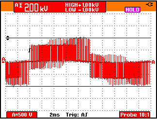 50 Hz馬達(dá)驅(qū)動(dòng)輸出電壓的脈寬調(diào)制信號(hào)的細(xì)節(jié)。1000V,50 微秒的脈沖即導(dǎo)致某些測(cè)試設(shè)備的不穩(wěn)定。