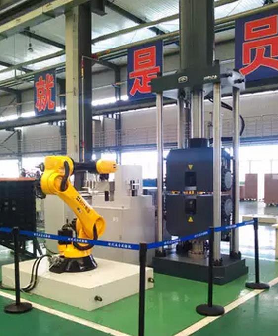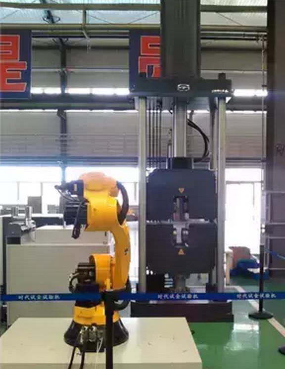 2000kN全自動(dòng)微機(jī)控制電液伺服拉力試驗(yàn)機(jī)是目前國(guó)內(nèi)最為先進(jìn)的自動(dòng)化試驗(yàn)系統(tǒng)應(yīng)用了80kg六自由度機(jī)器人、平推夾具、全自動(dòng)引伸計(jì)、尺寸測(cè)量平臺(tái)等,各部分全部由我公司自主研發(fā)。在整機(jī)測(cè)控系統(tǒng)的協(xié)調(diào)控制下實(shí)現(xiàn)試樣錄入與管理自動(dòng)送料、測(cè)量試樣尺寸、裝夾試樣、自動(dòng)完成拉伸試驗(yàn)自動(dòng)測(cè)量控制各種信號(hào)試驗(yàn)數(shù)據(jù)自動(dòng)分析及上傳自動(dòng)檢測(cè)與處理各種狀態(tài)及異常從而實(shí)現(xiàn)中厚板試樣的無(wú)人值守批量全自動(dòng)試驗(yàn)?刹婚g斷、高精度地完成批量試樣的材料力學(xué)性能測(cè)試。