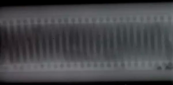 再從目前的焊接工藝水平來看經(jīng)過焊接的管體內(nèi)部表面非常的粗糙如圖2所示。而產(chǎn)品的工藝要求中并未對焊接后的內(nèi)部表面情況提出要求,只要求加熱器與管壁焊接良好不能存在加熱器與管壁未焊接相連的情況。因此由于內(nèi)部表面的各種堆積、裂紋等粗糙現(xiàn)象的存在將會使在超聲檢測中出現(xiàn)各種雜波影響檢測結果。另外經(jīng)焊接后的管體表面也很粗糙達不到超聲檢測所需的表面條件。因此超聲檢測也不適合加熱器與管體內(nèi)壁焊接情況的檢測。