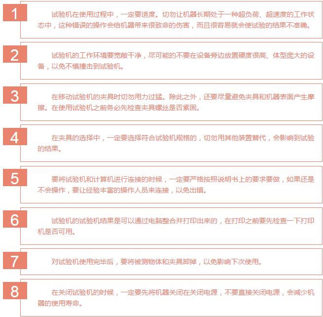 所有的機械設備的使用都要遵循它自身的工作原理還要根據實際的使用情況定期進行保養(yǎng)維護才能確保機器設備的正常使用。只有遵循以上兩點才可以延長機器的使用壽命讓機器更好的為人們服務。試驗機也不例外下面就跟大家分享一下試驗機在工作中需要注意的細節(jié):