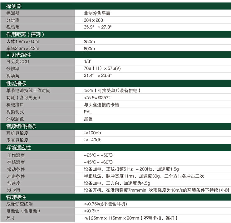 產(chǎn)品特點(diǎn) 多傳感器集成 集可見(jiàn)光、紅外、音頻于一體,紅外熱像儀測(cè)溫技術(shù),能在夜間及惡劣氣象條件下輔助單兵進(jìn)行偵察